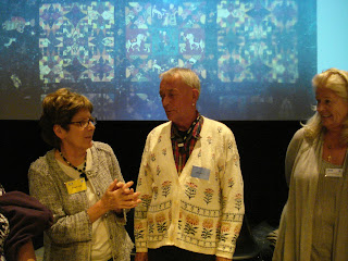 The quilting is hard to see, but is mostly cross hatching. Around the outside is a large twist, and then a triangular pattern with a lobed motif.