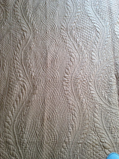 The quilting patterns are unusual - although a wholecloth, it has strippy or border patterns. Here you can see half a feather wreath used on the edge, with a running feather and a Welsh twist.